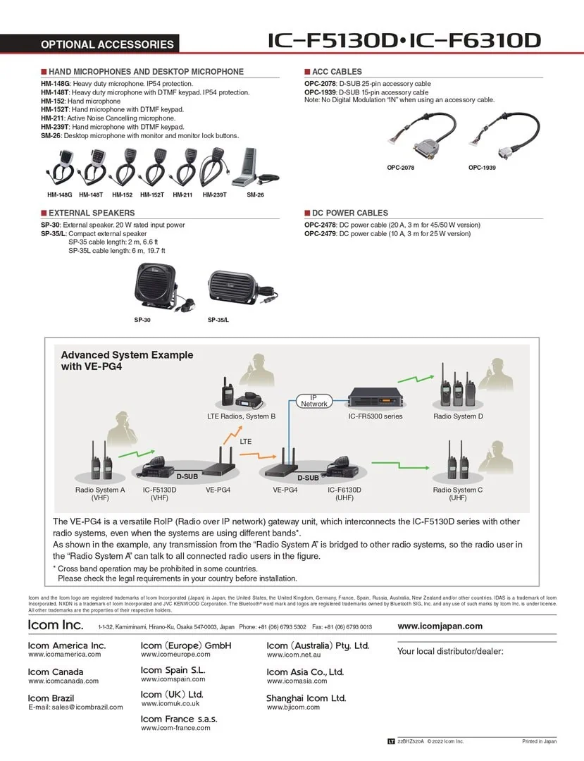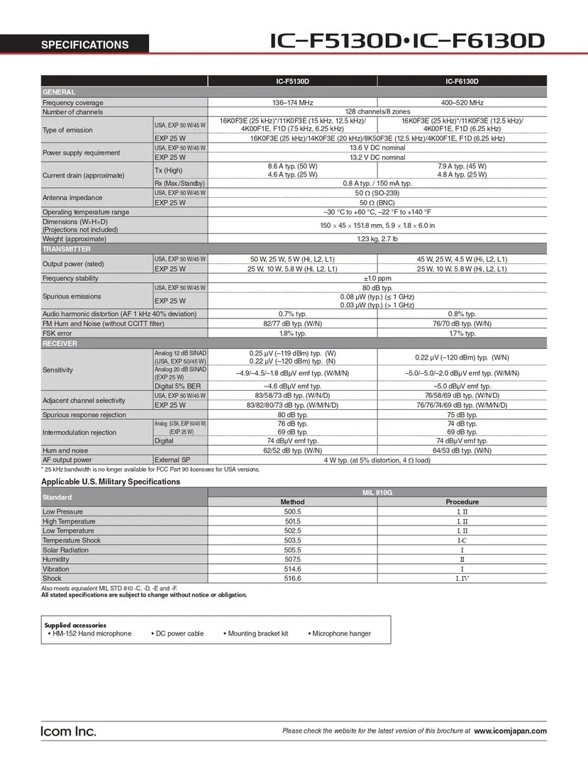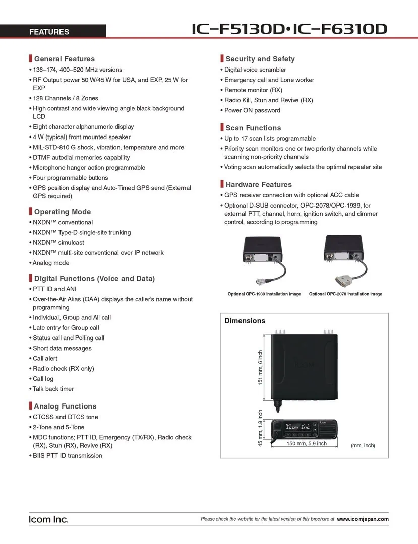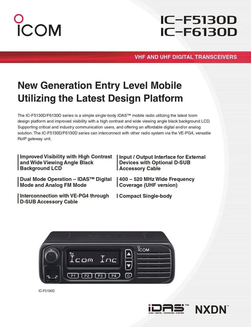 วิทยุสื่อสาร ICOM IC-F5130D เป็นเครื่องสำหรับหน่วยงานราชการ สังเคราะห์ความถี่ประเภท 2 ต้องโปรแกรมช่องความถี่ผ่านคอมพิวเตอร์ รองรับคลื่นความถี่ใช้งาน 136-174 Mhz สามารถใช้งานได้ 2 ระบบคือ AnalogและDigital