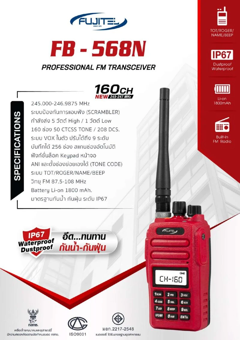 วิทยุสื่อสาร FUJITEL FB-568N มาพร้อมกับ 245.000-246.9875 MHz ระบบป้องกันการแอบฟัง (SCRAMBLER)กำลังส่ง 5 วัตต์ High / 1 วัตต์ Low160 ช่อง 50 CTCSS TONE กันน้ำ กันฝุ่น ระดับ IP6