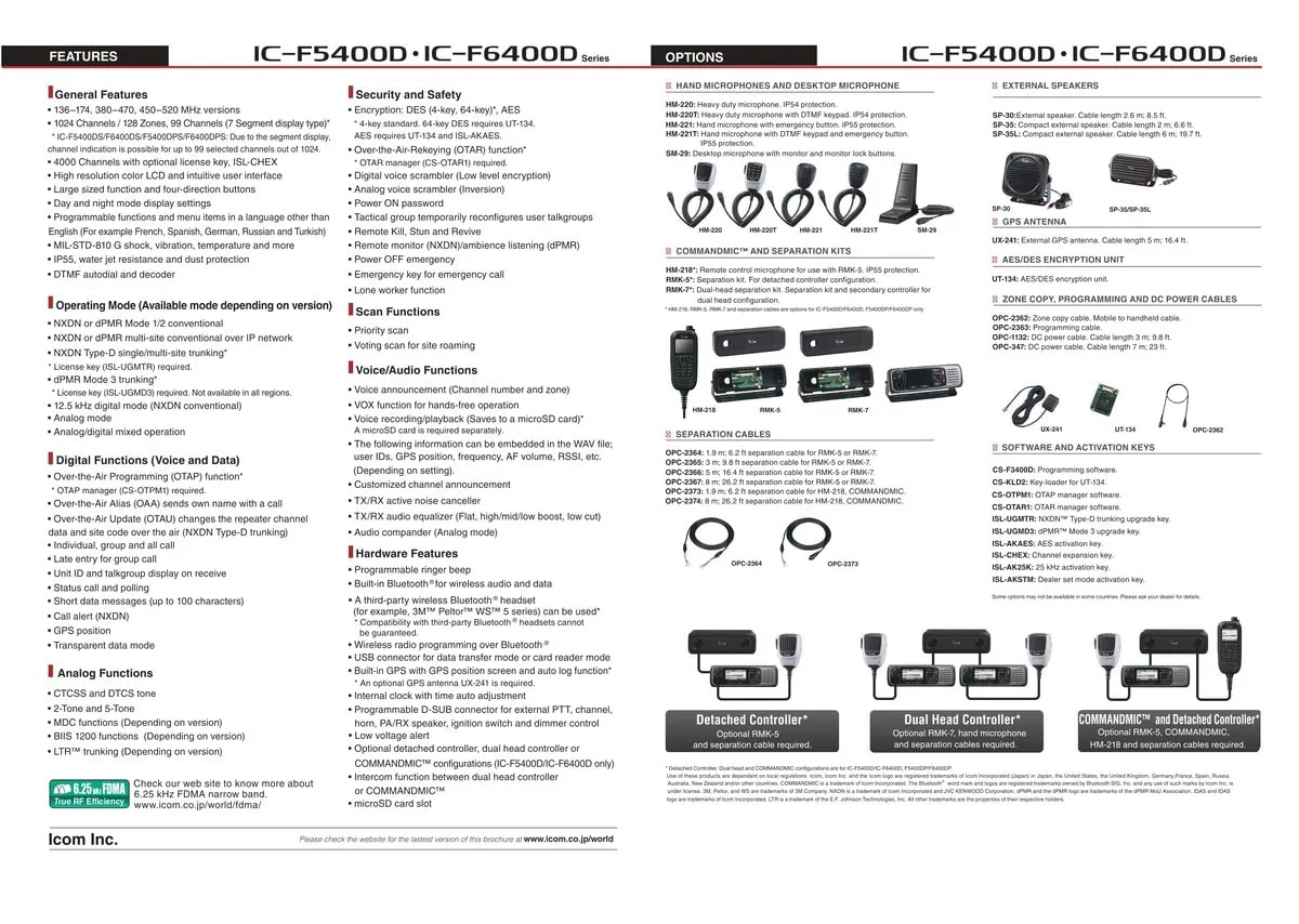 วิทยุสื่อสาร ICOM IC-F6400D สามารถใช้งานได้ 2 ระบบคือ AnalogและDigital มาตรฐาน FDMA ฟังก์ชั่นจัดเต็ม เครื่องบันทึกเสียงสนทนาผ่าน Micro SD Card ,มีGPSบอกตำแหน่งในการใช้งาน, ตัวเครื่องมีBluetooth & Wireless